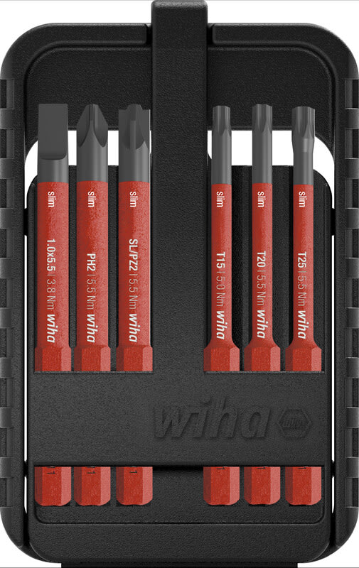 Parantaa turvallisuuttasi: Wiha Power slimBit -kärjet takaavat hyvän ja suojatun pääsyn syvällä oleviin ruuveihin. Helpottaa käsittelyä: Kompaktissa slimBit-kotelossa profiilit ovat hyvin näkyvissä ja ne voi ottaa käyttöön nopeasti. Tarjoaa täydellisen suojan: Kaikki työkalut testattu yksitellen 10 000 V AC:n jännitteellä ja hyväksytty 1 000 AC:n volttiin saakka. Jos ruuviliitoksen aikana käytetään liian paljon voimaa, materiaali voi vaurioitua. Tavanomaisten sähköasentajan ruuvimeisseleiden terän halkaisija on usein niin suuri, ettei niillä pääse käsiksi syvällä oleviin ruuveihin. Eristystä ei kuitenkaan saa poistaa ja vaarantaa turvallisuutta. Sähkötöitä varten kehitetyssä Wiha slimTECHNOLOGY -muotoilussa suojaeristys on integroitu terään jopa 33 % kapeampien terien mahdollistamiseksi. SlimBit-kärkien avulla pääset vaivattomasti käsiksi myös syvällä oleviin ruuvi- ja jousielementteihin. Eristetyille slimBit-kärjille suoritetaan kansainvälisen standardin IEC 60900 mukainen kappaletarkastus, ja ne mahdollistavat turvallisen työskentelyn jännitteisten osien parissa 1 000 V AC -jännitteeseen saakka. SlimBits-kärjet toimitetaan kärkikotelossa, jossa eri ruuviprofiilityypit ovat näkyvissä. Käyttö: Soveltuu jännitteisten osien ruuvaukseen 1 000 V AC saakka, erityisesti liikkuvaan käyttöön.