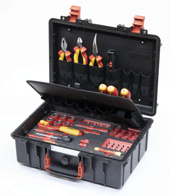 Työkalusarja teollisuussähköasennuksiin muovisalkussa L: 62-osainen mm. pihti-, ruuvimeisseli-, hylsy- ja momenttisarja. Teollisuussähkön perustyökalut, kun kohteena esim. sähköajoneuvot, latausasema, pikalatausasemat tai seinään asennettavat latauslaitteet. Hyvä aloituspaketti myös vastavalmistuneille ammattilaisille. Liikkuvassa työssä kaikkia tarvittavia työkaluja ei ole helppo kuljettaa mukana pitäen ne myös järjestyksessä. Salkun työkaluilla käyttäjä on erinomaisesti varustettu hybridi- ja sähköajoneuvojen asennusta ja korjausta varten. Kätevän salkun optimaaliseen perusvarustukseen kuuluu valikoima VDE-sertifioituja työkaluja 1000 V hyväksyttyihin työkohteisiin esim. sähköajoneuvojen akun, latausasemien, tai HPC-latureiden ja seinälle asennettujen latauslaitteiden asentamiseen ja käyttöönottoon. VDE-sertifiointi takaa maksimaalisen turvallisuuden näiden työkalujen kanssa työskenneltäessä. Lisäksi salkussa on ylimääräistä tilaa yksittäisille työkaluille. Polypropeenikotelo takaa kestävyyden ja se voidaan suojata varkauksilta riippulukoilla (eivät sisälly toimitusvarustukseen) kannen silmukoiden läpi. Ergonominen kaksikomponenttikahva takaa miellyttävän kantokokemuksen. Salkku voidaan ottaa mukaan myös lentokoneeseen ilmanpaineen kompensointiventtiilin ansiosta, ja se voidaan personoida omalla nimellä ja logolla. Suojausluokan IP 67 mukaisesti sertifioitu Wiha-työkalusalkku on pöly- ja vesitiivis. 20,2 litran kapasiteetillaan ja sallitulla 14,2 kg:n kantavuudellaan se on valmis monenlaisiin käyttöolosuhteisiin. Setti soveltuu myös turvalliseen työskentelyyn sähköteollisuuslaitoksissa. Mitat: 45,7 x 36,7 x 18,3 cm Testattu IEC 60900 -standardin mukaan.