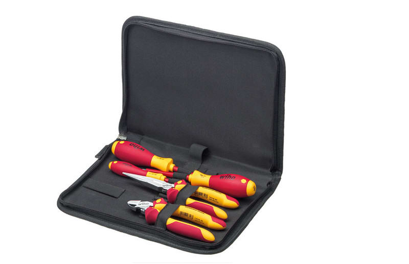 Parantaa tehokkuuttasi: Kompakti ja tilaa säästävä työkalulajitelma. Turvallista työskentelyä: Eristetyt työkalut on testattu yksitellen 10 000 voltissa ja hyväksytty 1 000 volttiin asti. Käyttö: {%s}Eristetyt työkalut on hyväksytty 1 000 volttiin asti. 1xKärkipihdit Professional electric suora terä (26727) 200 mm 1xProfessional-sivuleikkurit jännitetyöhön DynamicJoint®-nivelrakenteella (26741) 160 mm 1xRuuvimeisseli SoftFinish electric Phillips (00848) PH2x100 mm 1xRuuvimeisseli SoftFinish electric ura (00822) 3,5 mmx100 mm 1xRuuvimeisseli SoftFinish electric ura (00826) 5,5 mmx125 m.