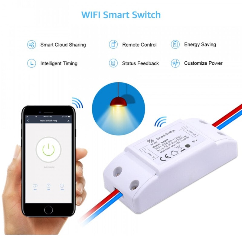 Woox R4967 on Wifi ohjattava älykäs virtakytkin/rele, jonka avulla käyttäjä voi kytkeä päälle ja pois kaikkia siihen liitettyjä laitteita.