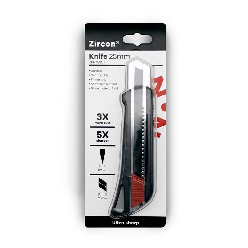 Zircon 25 mm katkoteräveitsi pikalukituksella. Soft touch -materiaalista valmistettu runko-osa takaa miellyttävän otteen veitsestä. Erittäin tarkka ruostumaton teräohjuri. Pinnoitettu Ultra Sharp -terä on valmistettu korkealaatuisesta SK-2H teräksestä. Soveltuvat varaterät: ZN-B70 & ZN-N70.